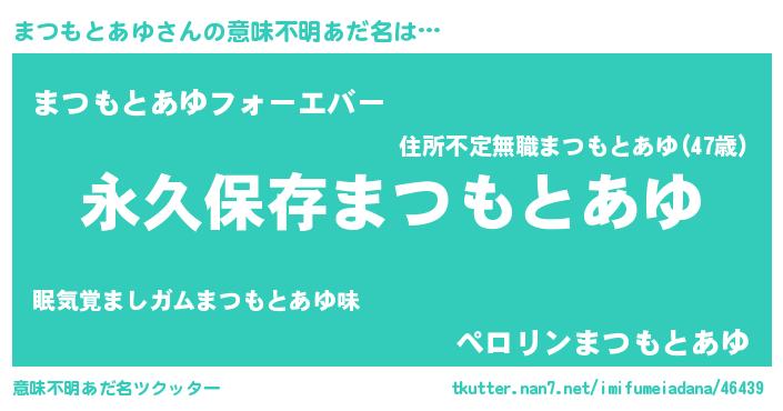 | ヒーロー風カッコイイあだ名 | 『ネオマツモトアユ』『仮面マツダー』 |