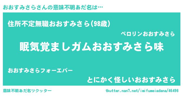 | 男性向けラノベタイトル風あだ名 | 『ノーゲーム・ノーオオスミサラ』 |