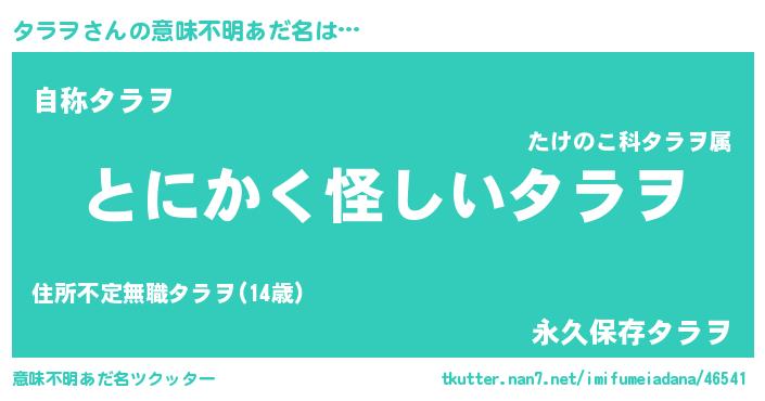 | 男性向けラノベタイトル風あだ名 | 『タラヲの嫁は女の子じゃないと思った?』 |