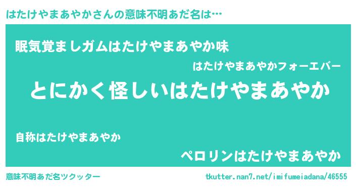 | 男性向けラノベタイトル風あだ名 | 『はたけやまあやかの嫁は女の子じゃないと思った?』 |