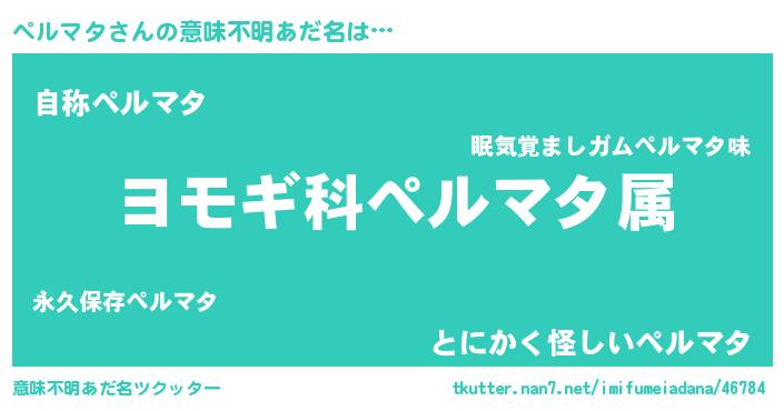 | 男性向けラノベタイトル風あだ名 | 『ペルマタ~年齢イコール彼女いない歴の魔法使い~』 |