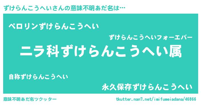 | 男性向けラノベタイトル風あだ名 | 『ずけらんこうへい~年齢イコール彼女いない歴の魔法使い~』 |