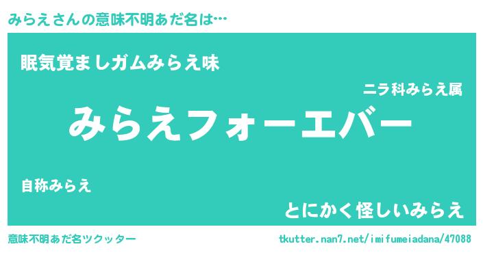 | 女子向けラノベタイトル風あだ名 | 『みらえの婚約者』『みらえ様がみてる』 |