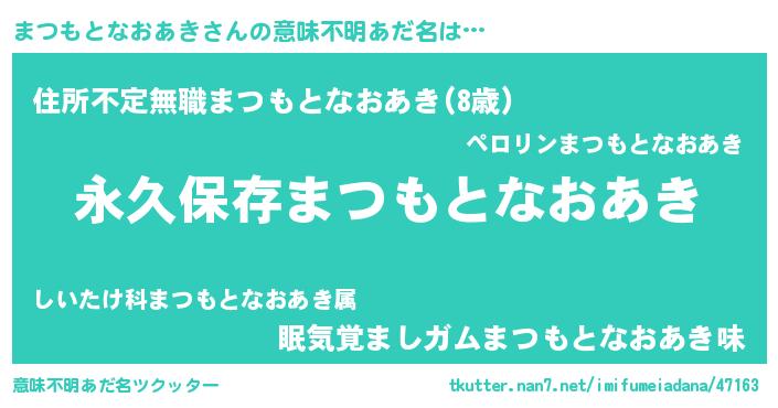 | 男性向けラノベタイトル風あだ名 | 『まつもとなおあきという概念が存在しない退屈な世界 』 |