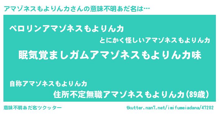 | 男性向けラノベタイトル風あだ名 | 『ノーゲーム・ノーアマゾネスモヨリンカ』 |
