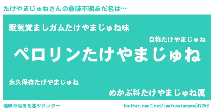 | ヘコむあだ名 | 『たけにー』『たけやまじゅね(震え声)』 |