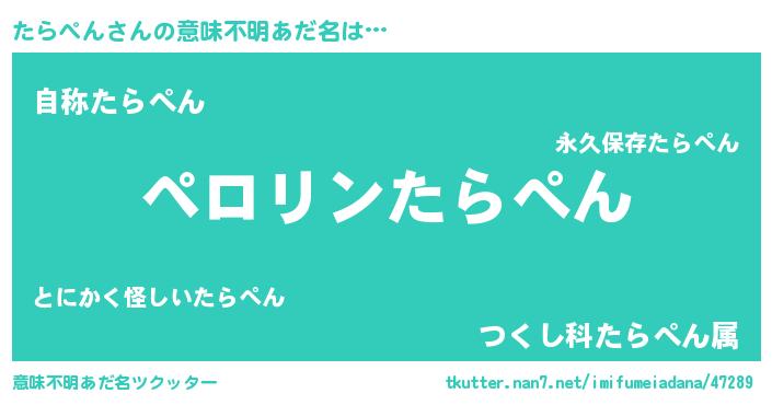 | 男性向けラノベタイトル風あだ名 | 『たらぺんの憂鬱』 |