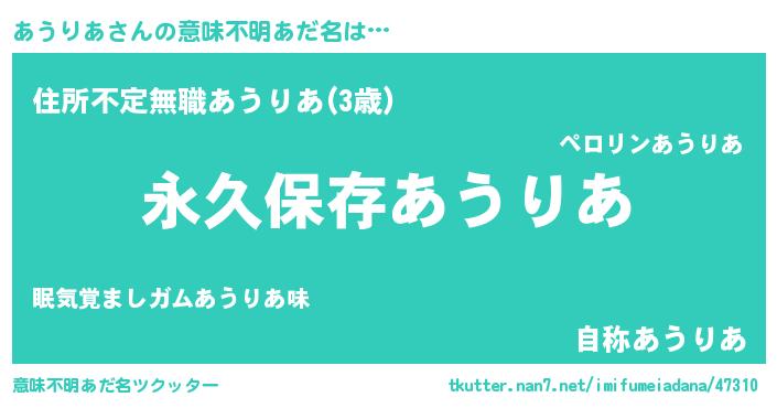 | ヘコむあだ名 | 『あうりあ(爆)』『あうにー』 |