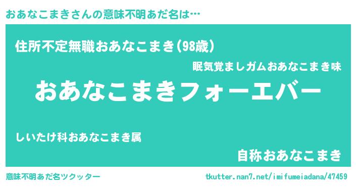 | 女子向けラノベタイトル風あだ名 | 『おあなこまきの雑貨屋さん』 |