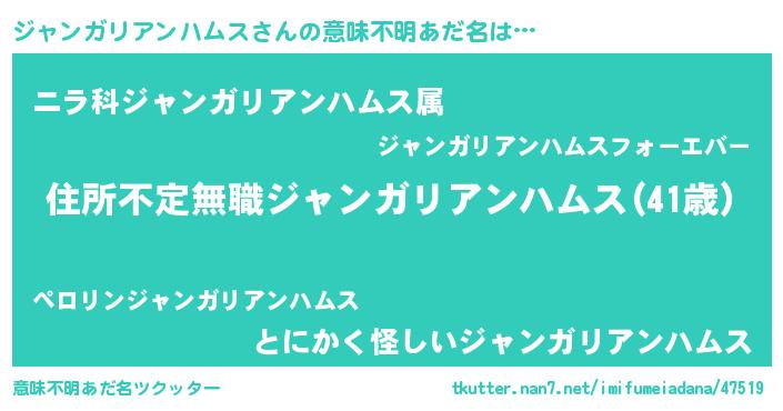 | 男性向けラノベタイトル風あだ名 | 『魔弾の王とジャンガリアンハムス』 |