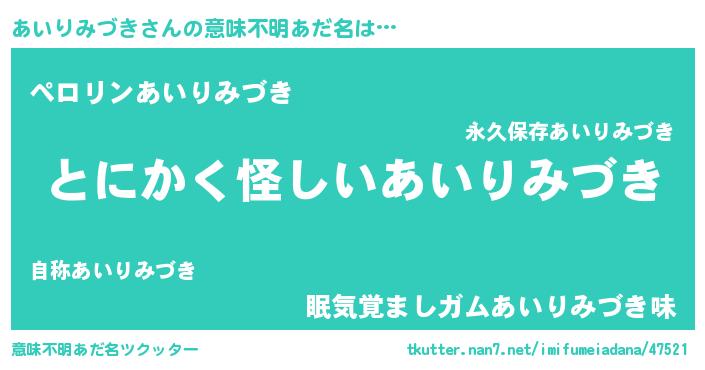 | 男性向けラノベタイトル風あだ名 | 『あいりみづきの嫁は女の子じゃないと思った?』 |