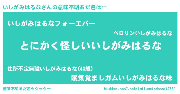| ポケモン風あだ名 | 『ヒイシガミハルナ』『イシガダネ』 |