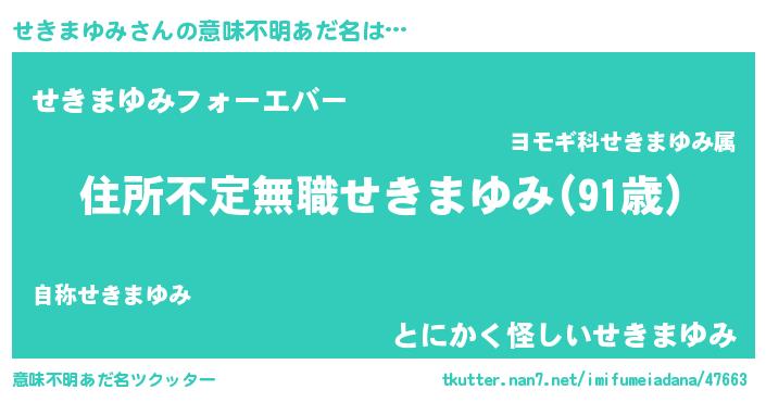 | 男性向けラノベタイトル風あだ名 | 『この素晴らしい世界にせきまゆみを!』 |