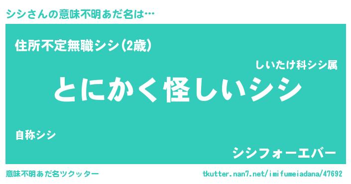 | 料理風あだ名 | 『シシの豆乳スープ』『シシごはん』 |