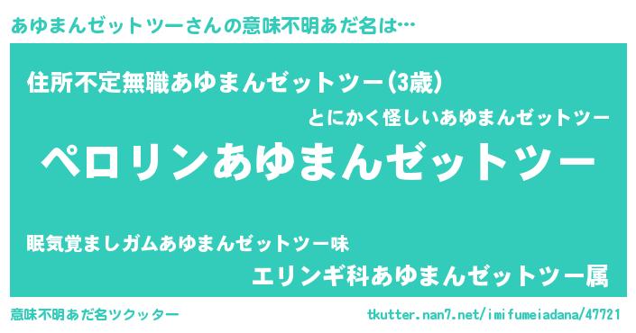 | 男性向けラノベタイトル風あだ名 | 『アユマンゼットツーアートオンライン』 |