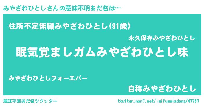 | 男性向けラノベタイトル風あだ名 | 『おまえをオタクにしてやるから、俺をみやざわひとしにしてくれ! 』 |