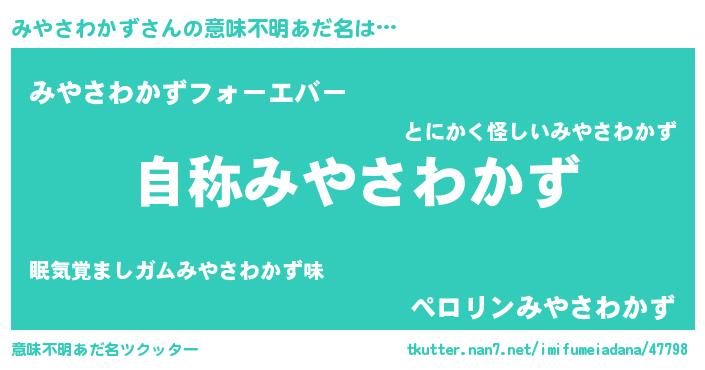 | 男性向けラノベタイトル風あだ名 | 『Re:みやさわかずから始める異世界生活』 |