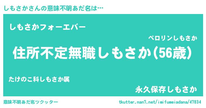 | 男性向けラノベタイトル風あだ名 | 『この素晴らしい世界にしもさかを!』 |