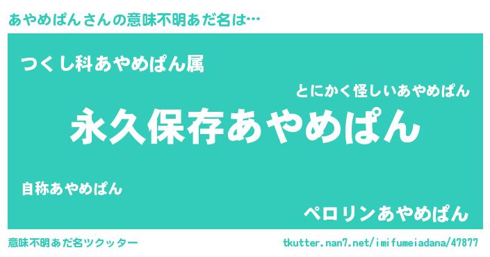 | 胡散臭い通販商品みたいなあだ名 | 『来世でも幸せになれる水素水…その名も「あやめぱん」』 |
