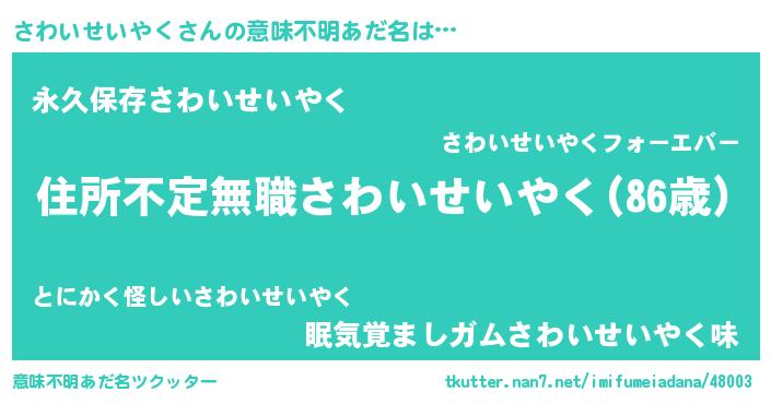 | 胡散臭い通販商品みたいなあだ名 | 『あなたにだけ特別に提供する世界で10本だけ現存している希少なブランデー…その名も「さわいせいやく」』 |
