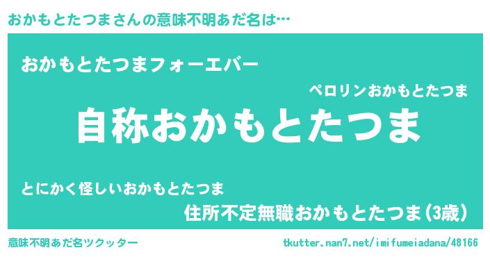 | 男性向けラノベタイトル風あだ名 | 『Re:おかもとたつまから始める異世界生活』 |