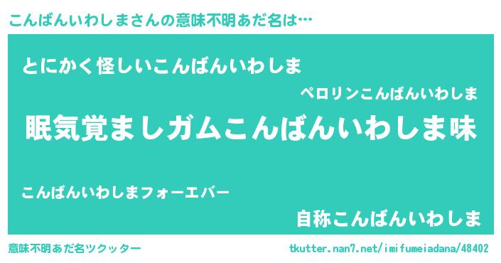 | 男性向けラノベタイトル風あだ名 | 『ノーゲーム・ノーコンバンイワシマ』 |