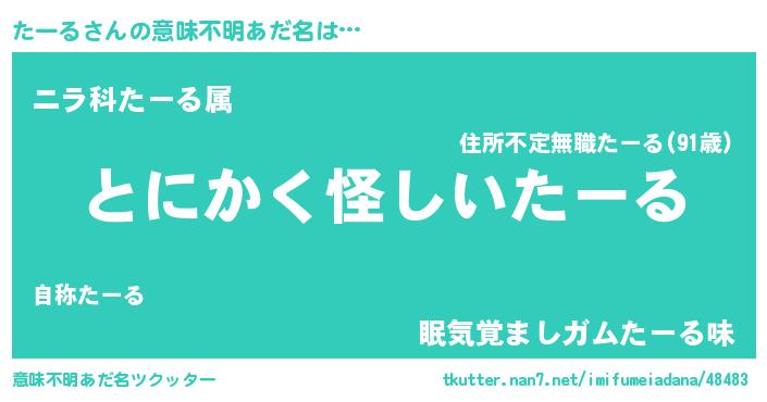 | 男性向けラノベタイトル風あだ名 | 『たーるの嫁は女の子じゃないと思った?』 |