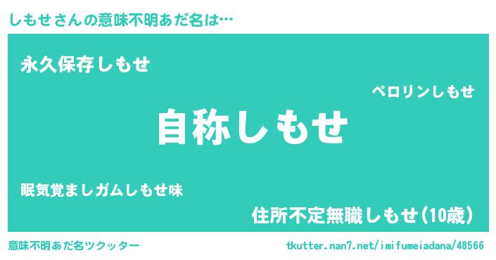 | 男性向けラノベタイトル風あだ名 | 『Re:しもせから始める異世界生活』 |