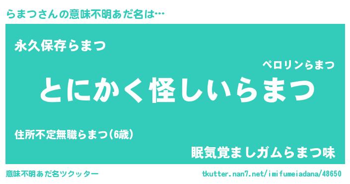 | 胡散臭い通販商品みたいなあだ名 | 『信頼と実績のサプリメント…その名も「らまつ」』 |