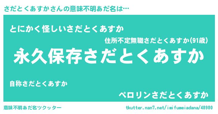 | 胡散臭い通販商品みたいなあだ名 | 『前代未聞の健康食品…その名も「さだとくあすか」』 |