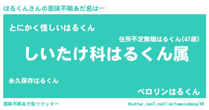 | 胡散臭い通販商品みたいなあだ名 | 『信頼と実績のサプリメント…その名も「はるくん」』 |