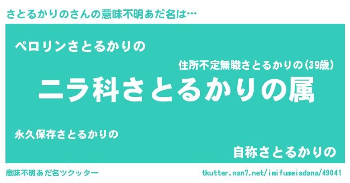 | 男性向けラノベタイトル風あだ名 | 『さとるかりの~年齢イコール彼女いない歴の魔法使い~』 |