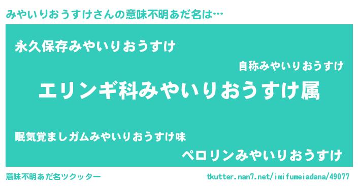 | 胡散臭い通販商品みたいなあだ名 | 『絶対に幸福をもたらす健康食品…その名も「みやいりおうすけ」』 |