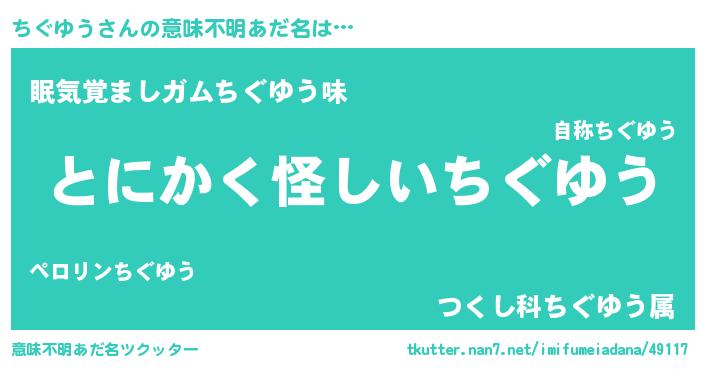 | 胡散臭い通販商品みたいなあだ名 | 『信頼と実績のサプリメント…その名も「ちぐゆう」』 |