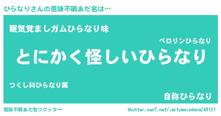 | 女子向けラノベタイトル風あだ名 | 『ひらなりの卵を拾いまして』 |
