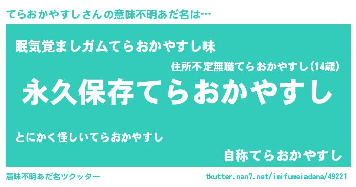 | 胡散臭い通販商品みたいなあだ名 | 『絶対に幸福をもたらす健康食品…その名も「てらおかやすし」』 |