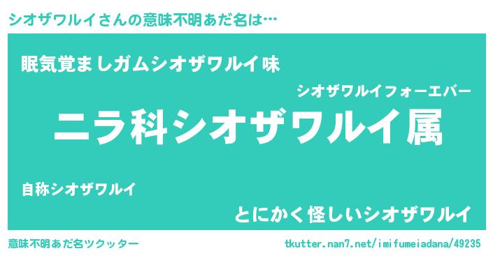 | 男性向けラノベタイトル風あだ名 | 『シオザワルイ~年齢イコール彼女いない歴の魔法使い~』 |