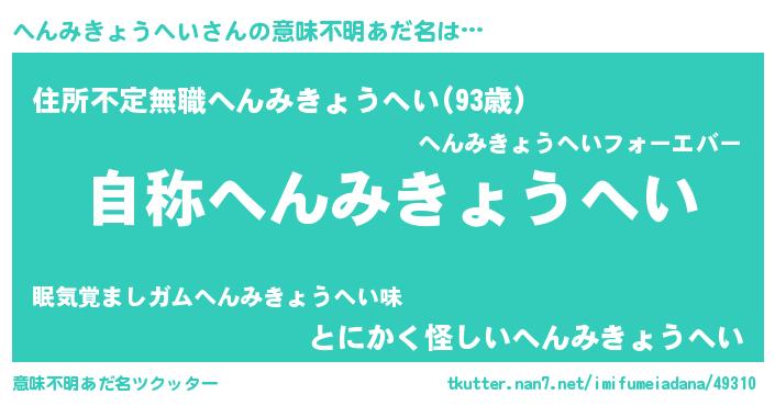 | 男性向けラノベタイトル風あだ名 | 『Re:へんみきょうへいから始める異世界生活』 |