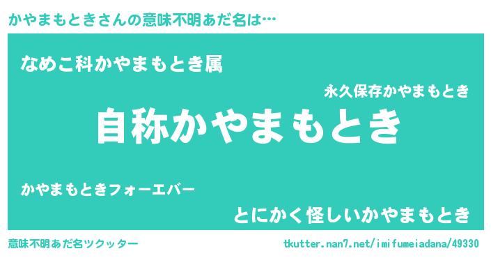 | 男性向けラノベタイトル風あだ名 | 『Re:かやまもときから始める異世界生活』 |