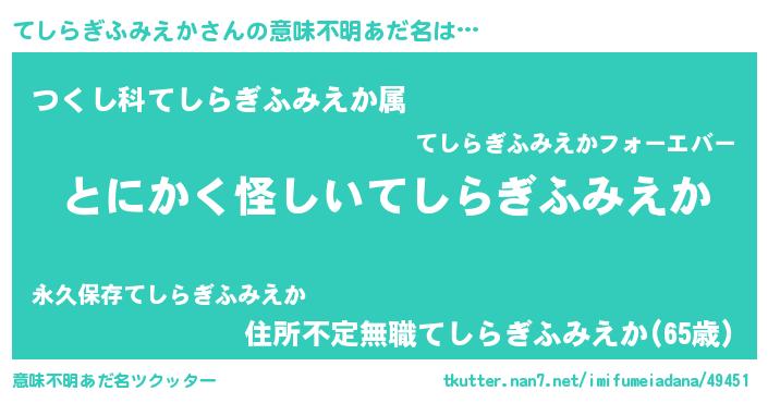 | 男性向けラノベタイトル風あだ名 | 『てしらぎふみえかの嫁は女の子じゃないと思った?』 |
