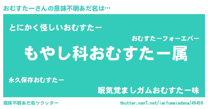 | 男性向けラノベタイトル風あだ名 | 『転生したらおむすたーだった件』 |