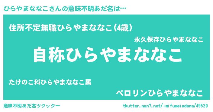 | 男性向けラノベタイトル風あだ名 | 『Re:ひらやまななこから始める異世界生活』 |