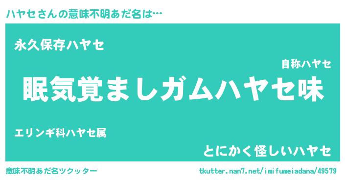 | 男性向けラノベタイトル風あだ名 | 『おまえをオタクにしてやるから、俺をハヤセにしてくれ! 』 |