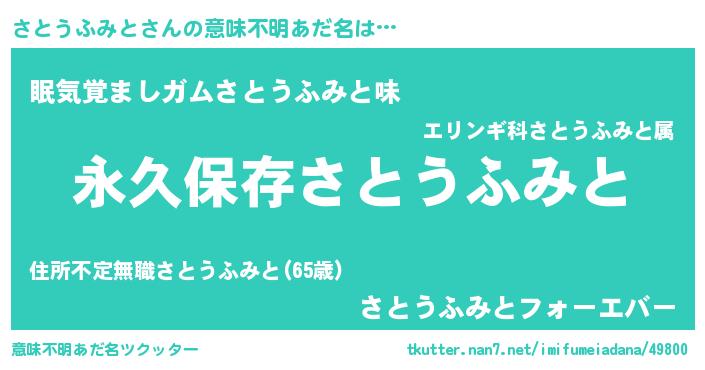 | 胡散臭い通販商品みたいなあだ名 | 『前代未聞の健康食品…その名も「さとうふみと」』 |