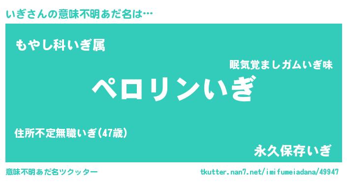 | 男性向けラノベタイトル風あだ名 | 『いぎの憂鬱』『転生したらいぎだった件』 |