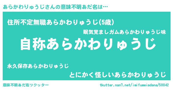 | 男性向けラノベタイトル風あだ名 | 『Re:あらかわりゅうじから始める異世界生活』 |