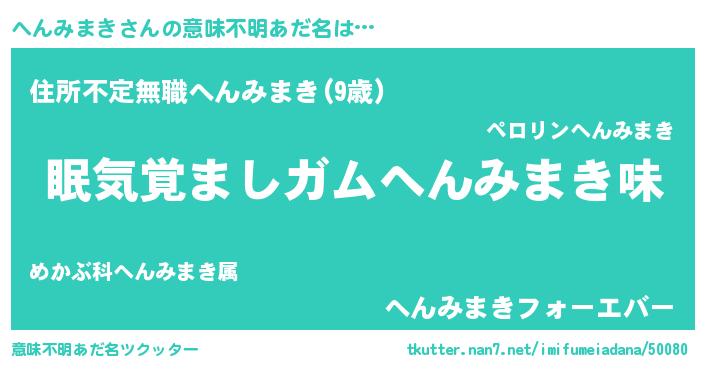 | 男性向けラノベタイトル風あだ名 | 『おまえをオタクにしてやるから、俺をへんみまきにしてくれ! 』 |