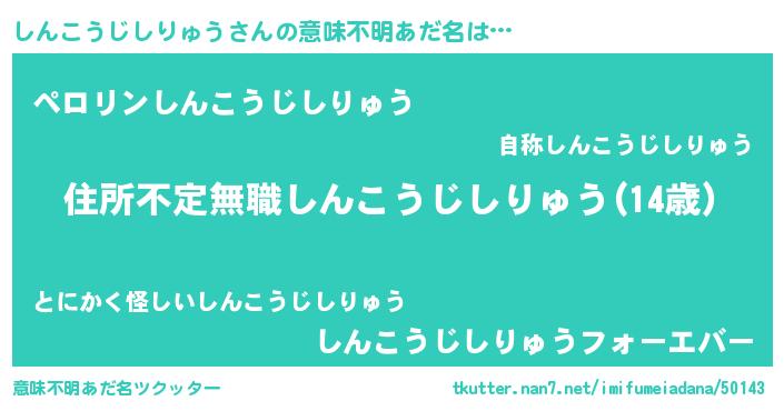 | 男性向けラノベタイトル風あだ名 | 『この素晴らしい世界にしんこうじしりゅうを!』 |