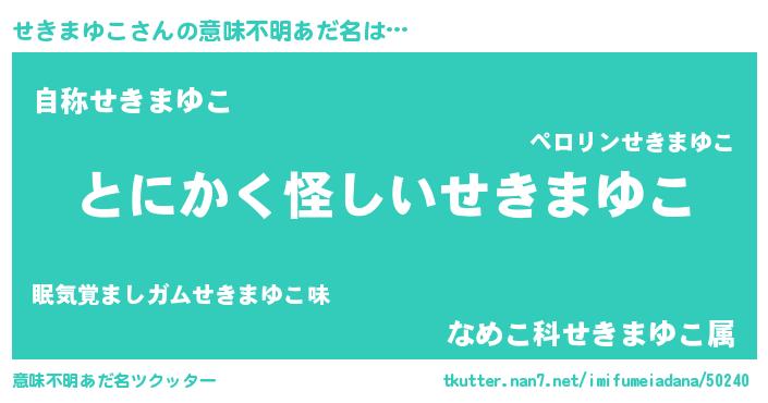 | 女子向けラノベタイトル風あだ名 | 『せきまゆこの卵を拾いまして』 |