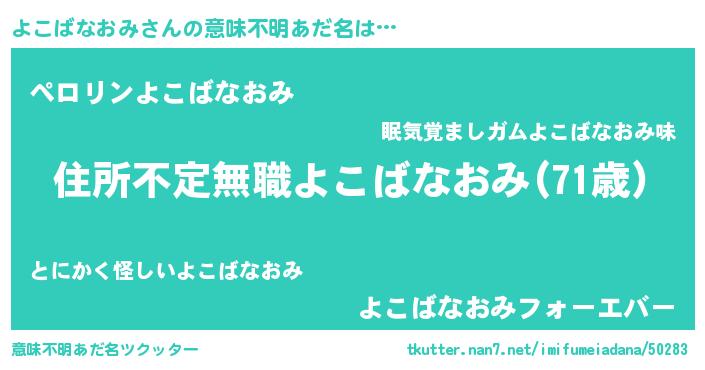 | 男性向けラノベタイトル風あだ名 | 『魔弾の王とよこばなおみ』 |